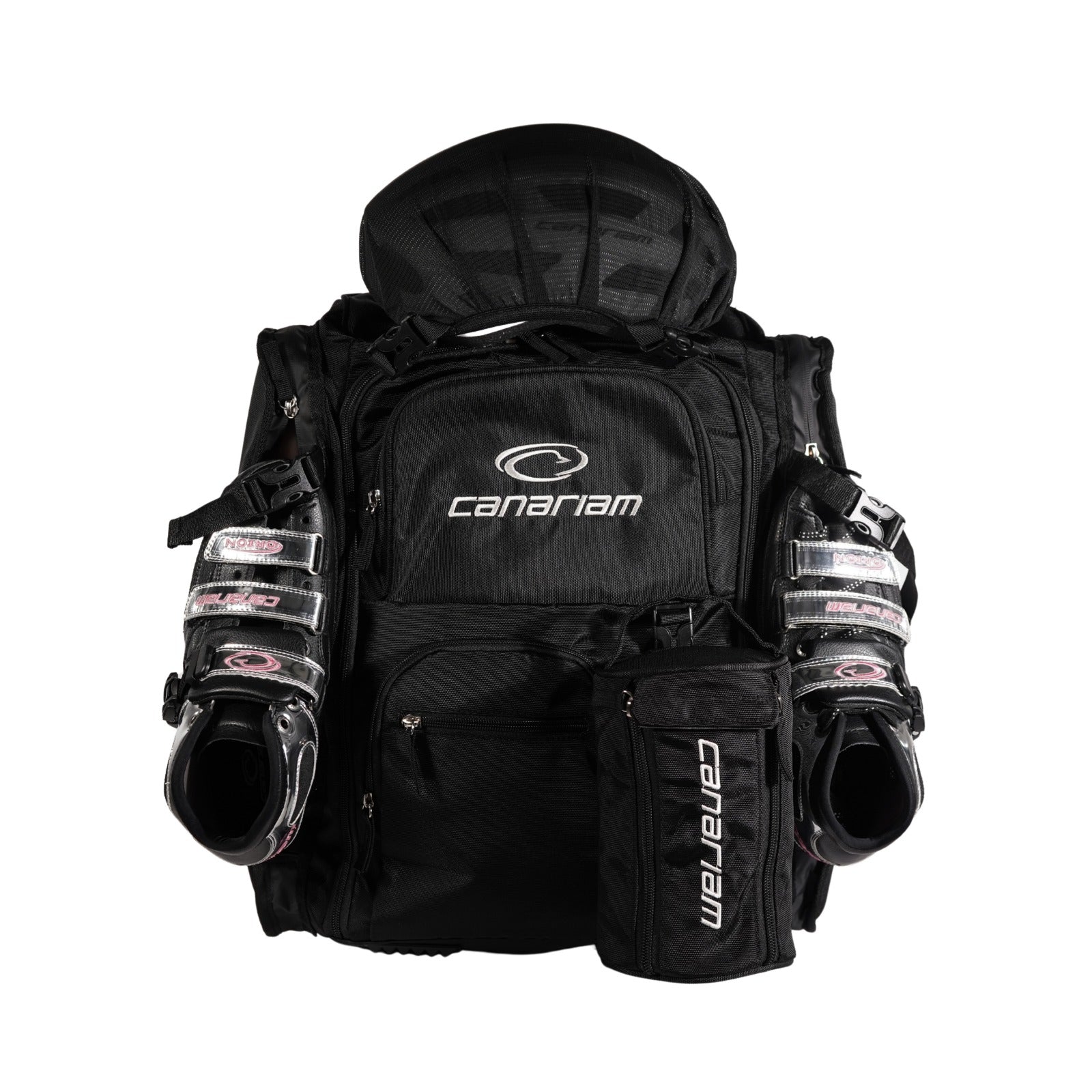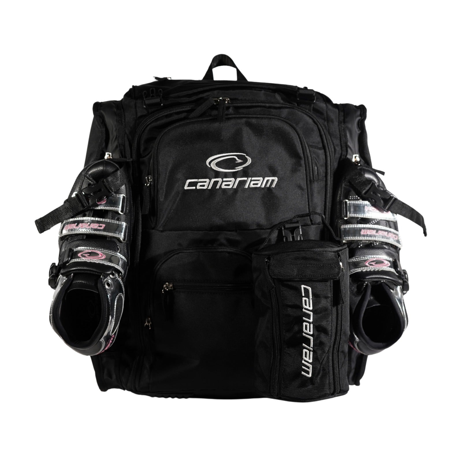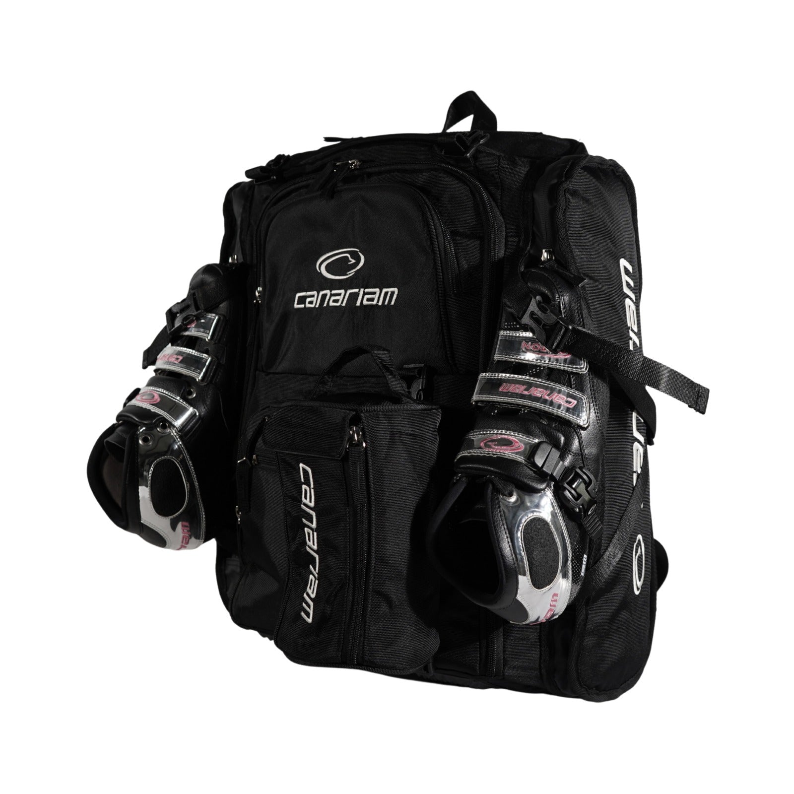 - Porta patines laterales con correas y buckles de seguridad para sujetar los patines.
